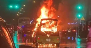 Hà Nội chứng kiến ô tô bốc cháy dữ dội giữa cơn mưa nặng hạt